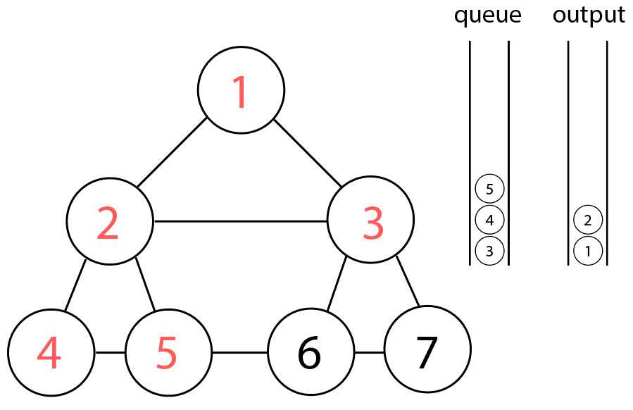큐에서 먼저들어온 2를 꺼내서 출력하고 인접해있던 노드 4와 5를 큐에 넣고 방문 완료합니다.