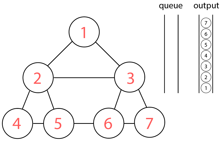 모든 노드가 방문처리 되었으므로 큐에 들어있던 나머지 노드들은 들어온 차례대로 출력되고 BFS 탐색이 종료됩니다.