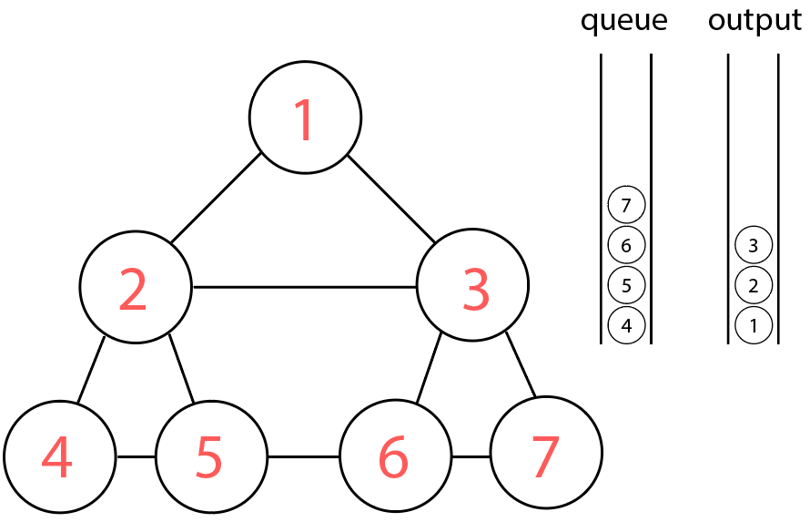 큐에서 먼저들어온 3을 꺼내서 출력하고 인접해있던 노드 6과 7을 큐에 넣고 방문 완료합니다.