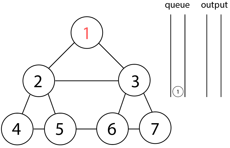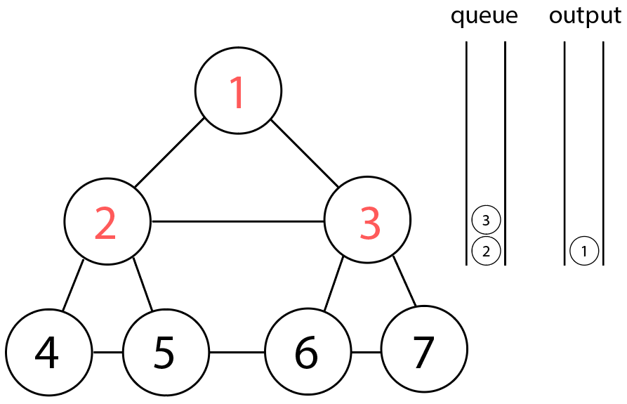 큐에 들어있던 1을 꺼내서 출력하고 인접해있던 노드 2와 3을 큐에 넣고 방문 완료합니다.