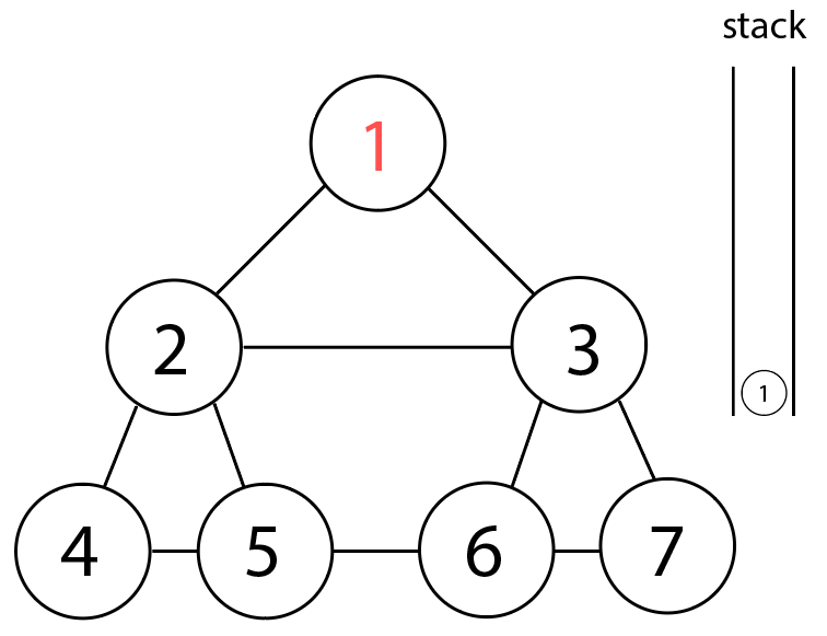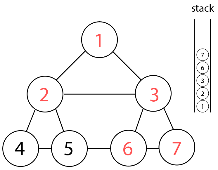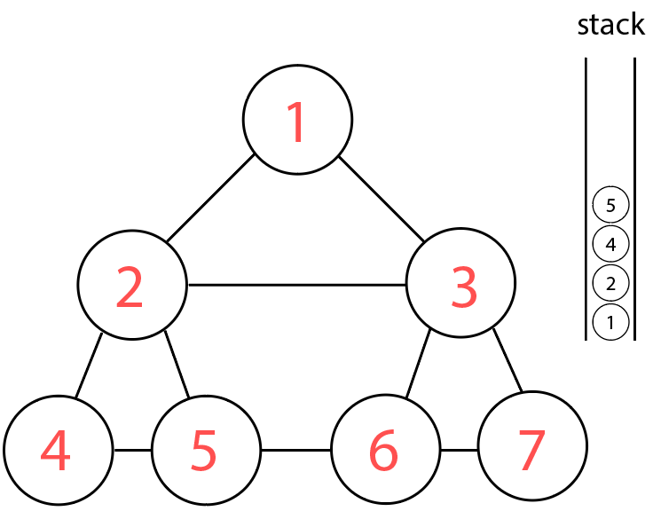 이후 방문되지 않은 노드4와 5를 찾아서 스택에 넣습니다. 모든 노드의 방문이 완료되었으므로 스택에서 노드가 하나씩 나가게 됩니다. 방문 탐색 순서는 1 - 2 - 3 - 6 - 7 - 4 - 5 입니다.