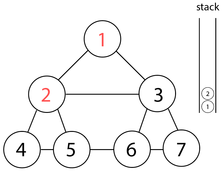 인접해있던 노드 2를 스택에 넣고 방문 완료합니다.