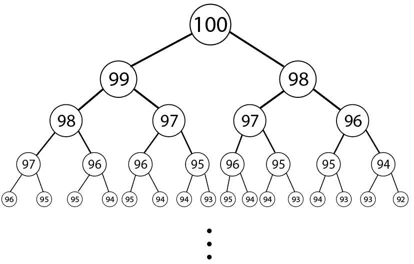 i[5]처럼 연산 수가 적은 구조에서는 분할 정복과 다이나믹 프로그래밍의 연산 수 차이가 적어보일 수 있지만 만약 i[100]같은 수의 피보나치 수열 값을 구한다면 어떻게 될까요? 아마도 컴퓨터가 이 값을 분할 정복 기법으로 처리하려면 엄청난 시간이 소요될 것입니다. 100에서 99와 98로 나누어지는 데 연산 수는 2, 그 밑으로 연산 수가 4, 8, 16 ... 가 되므로 2^n 이라는 수가 나옵니다. 한마디로 i[100]을 처리하려면 2의 100승인 1,267,650,600,228,229,401,496,703,205,376번의 연산을 해야하기 때문입니다. 이러한 비효율성 때문에 다이나믹 프로그래밍을 사용합니다.