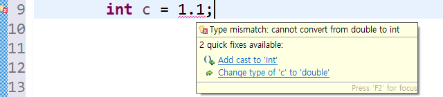 정수의 값이 들어가야 할 변수c에 실수인 1.1이 들어가 있으므로 오류가 발생한다. 이 오류를 빠르게 해결하기 위해 오류 부분에 마우스 커서를 대면 이클립스가 자동으로 해결책을 제시한다.