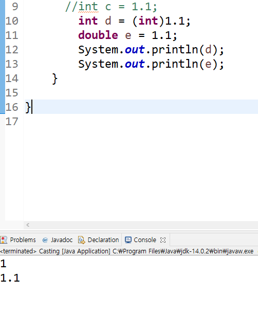 첫 번째 항목을 선택하면 결과적으로 변수 d는 캐스팅됨에 따라 1.1의 소수점 값이 손실되어 정수 1의 값으로 출력된다.