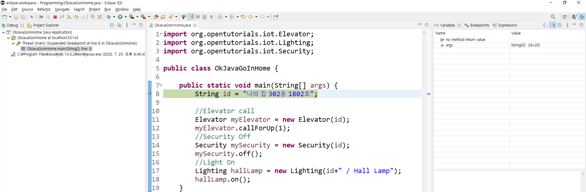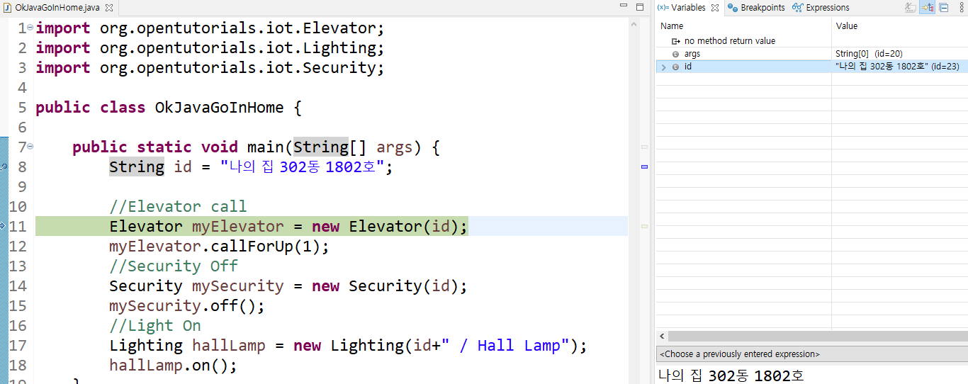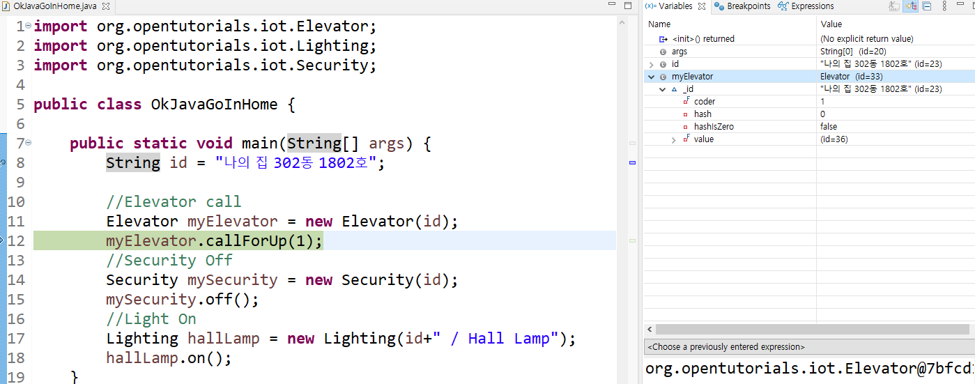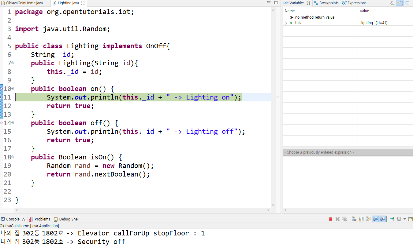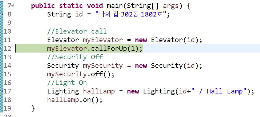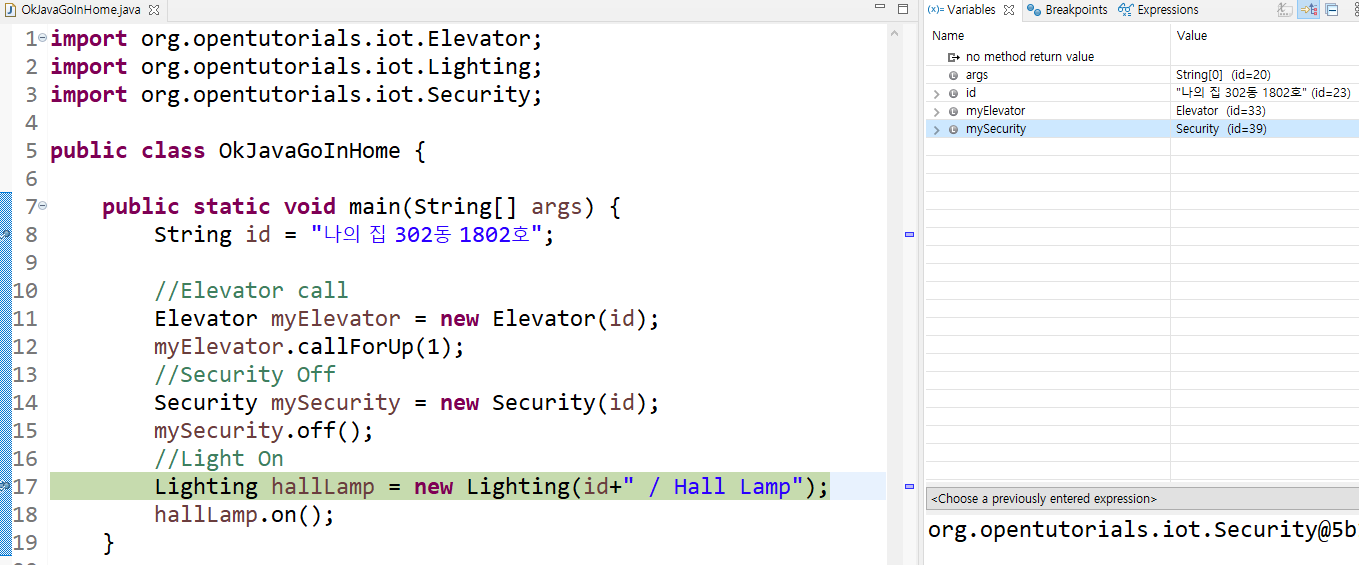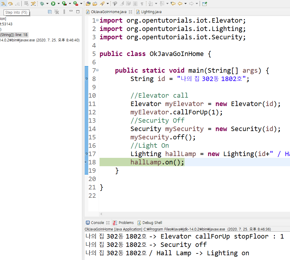 만약 귀찮아서 Security 부분을 넘기고 바로 Lighting 부분까지 한번에 디버그한 후 Lighting hallLamp 부분에서 멈추고 싶다면 해당 코드 줄을 더블클릭한 후 상단의 Resume버튼을 누르면 다음 breakpoint가 나올때까지 한꺼번에 실행하게 된다.