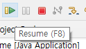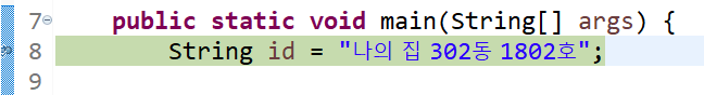 디버그 perspective 창이 뜨게 되면 파란색 점 옆에 작은 화살표같은 아이콘이 추가되어 있는것을 볼 수 있는데 이것은 현재 8번줄에서 실행이 중단되어 있음을 의미한다.