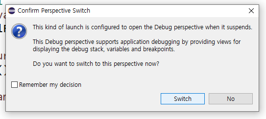버튼을 클릭하면 Perspective Switch, 즉 창을 디버그를 하기에 보기 좋은 관점으로 바꾸겠냐는 창이뜨며 Switch를 누르면 오른쪽 상단에 Debug버튼의 창이 생성된 것을 볼 수 있다. 이것들을 Perspective 라고 부른다.