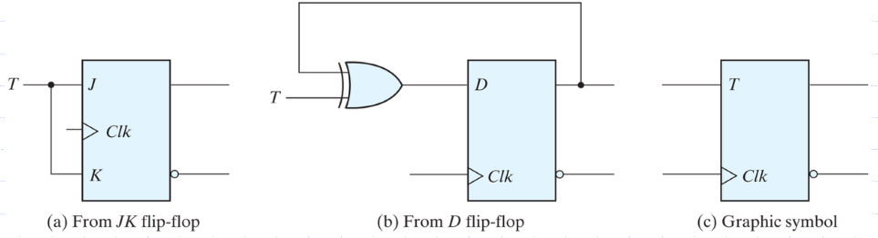입력값 T와 현재 상태 값을 XOR한 값이 다음 상태가 됨. (입력값이 바로 다음 상태가 되는 D플립플롭가 차별점)