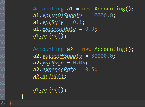 a1이라는 이름을 붙여 변수 a1의 값으로는 반드시 Accounting의 복제본만 들어올 수 있다는 뜻으로 코드를 작성하고 a1에 공급가, 세율, 비용값을 넣어주고 또다른 복제본 a2를 만들어 마찬가지로 입력시켜준다.