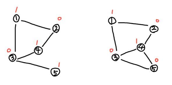 정점을 1 또는 0으로 표현했을 때 같은 집합 안에서 1과 1이 인접하거나 0과 0인 정점이 인접하는 경우가 없다면 이분그래프입니다.