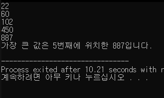 즉 i가 0번째부터 4번째까지 5개의 배열 값으로 반복하여 max는 0부터 시작하여 i값이 들어올때 그 값이 0보다 크고 이전 배열보다 크다면 그 값을 max에 입력시키고 순서는 해당 index의 i번째 순서가 된다.