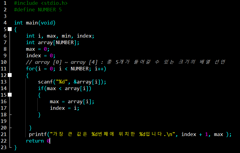 배열은 데이터를 담아놓는 상자와도 같다. 상수 5를 지정해주고 array[NUMBER]를 입력해주면 NUMBER의 수치 많큼 배열의 크기를 지정해준다는 의미이다.